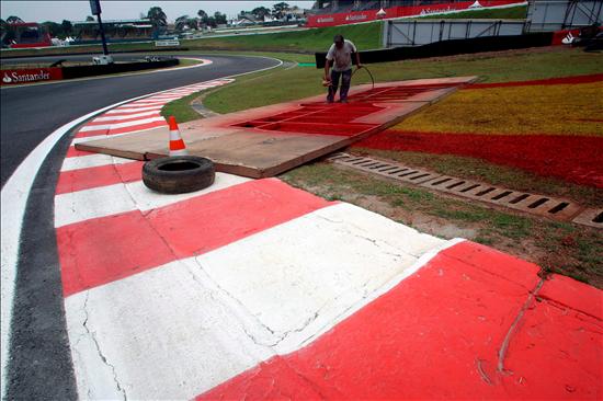 Un obrero prepara un gran cartel de aviso para el Gran Premio de F1 de Brasil, en el circuito de Interlagos. (EFE)