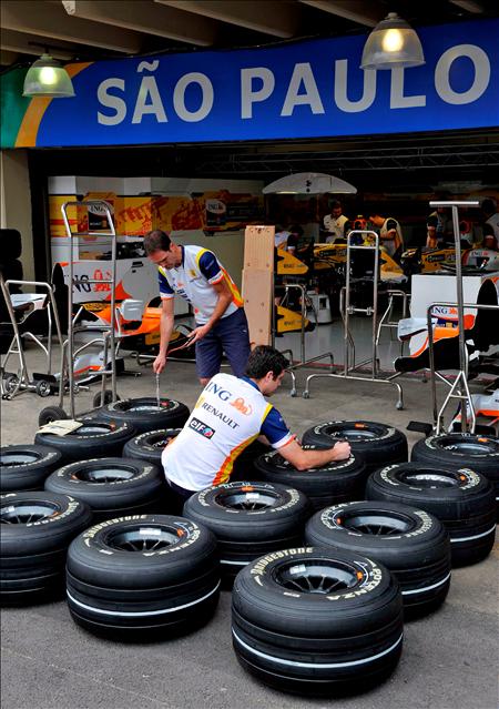Mecánicos de Renault ponen a punto neumáticos en el "pit lane". (EFE)