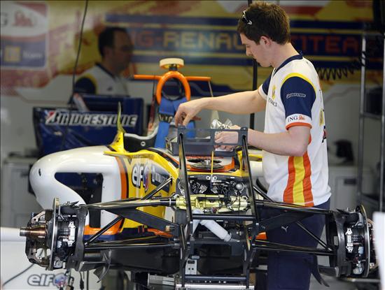 Un mecánico de la escudería Renault trabaja en los boxes. (EFE)
