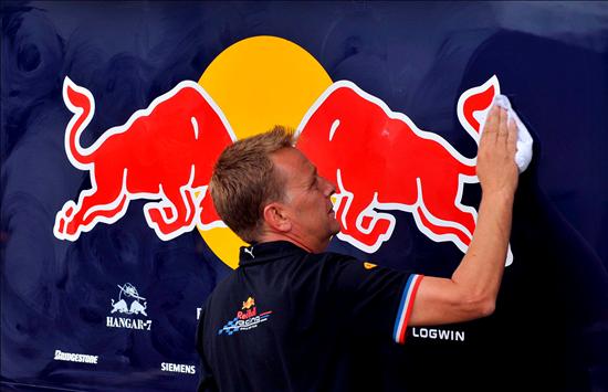 Un mecánico de Red Bull saca brillo al logotipo de la escudería en Interlagos. (EFE)