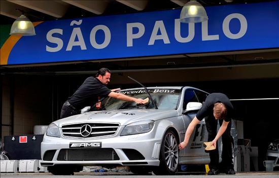 Dos trabajadores limpian el coche médico de Interlagos. (EFE)