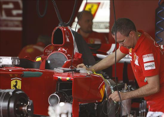 Los mecánicos de Ferrari trabajan en uno de los monoplazas. (EFE)