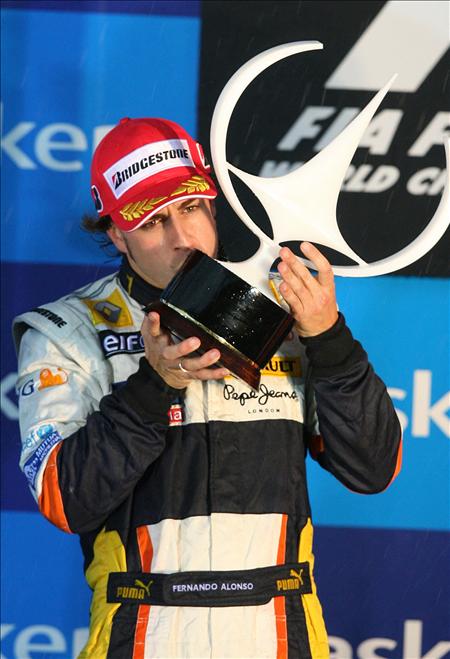 El piloto español Fernando Alonso besa el trofeo correspondiente a su segundo puesto en el Gran Premio de Brasil. (EFE)