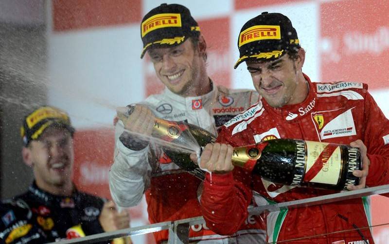 Entre Vettel y Alonso se metió el británico Jenson Button (McLaren), que nunca tuvo opciones de poder llegar a disputarle el triunfo al alemán, finalmente vencedor con 8,9 segundos de margen al completarse las dos horas de carreras, dos vueltas antes de las 61 previstas sobre Marina Bay.