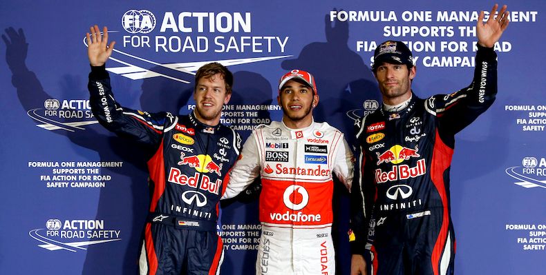 El inglés Lewis Hamilton (c) ha logrado en el circuito de Yas Marina su sexta pole position de la temporada al superar en la sesión de clasificación a los dos pilotos de Red Bull, el australiano Mark Webber (d), que saldrá segundo, y el alemán Sebastian Vettel.