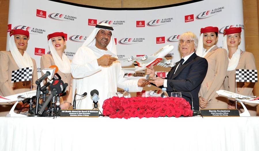 Bernie Ecclestone, CEO del grupo Fórmula Uno, comentó: "Emirates tiene un renombre internacional de primer orden y estoy muy satisfecho de dar la bienvenida como socio global de la Fórmula Uno a una compañía tan prestigiosa. Los clientes de Emirates podrán disfrutar de las carreras de Fórmula Uno en directo durante el vuelo, y la presencia de la marca Emirates en muchas carreras del calendario será un fuerte apoyo a sus ambiciosos planes de expansión. Teniendo en cuenta que muchos de sus mercados prioritarios coinciden con los nuestros, estoy convencido que nos esperan muchos años de colaboración exitosa en el marco de esta importante asociación".