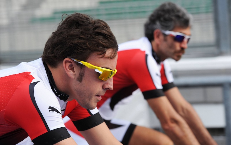 Fernando Alonso recorre el circuito de Sepang en bicicleta junto a uno de los fisioterapeutas del equipo Ferrari.