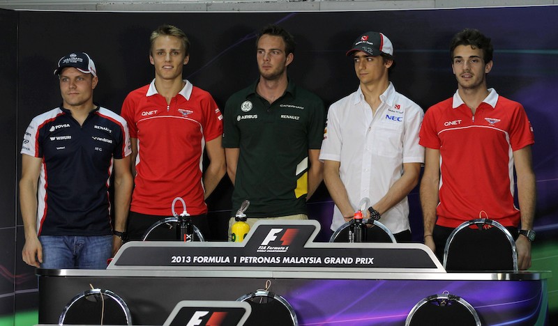 De izquierda a derecha, el finlandés Valtteri Bottas (Williams), el británico Max Chilton (Marussia), el holandés Giedo Van der Garde (Caterham), el mexicano Esteban Gutiérrez (Sauber) y el francés Jules Bianchi (Marussia).