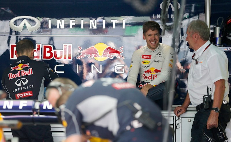 El piloto alemán Sebastian Vettel mantiene una conversación distendida con el asesor de Red Bull, Helmut Marko.