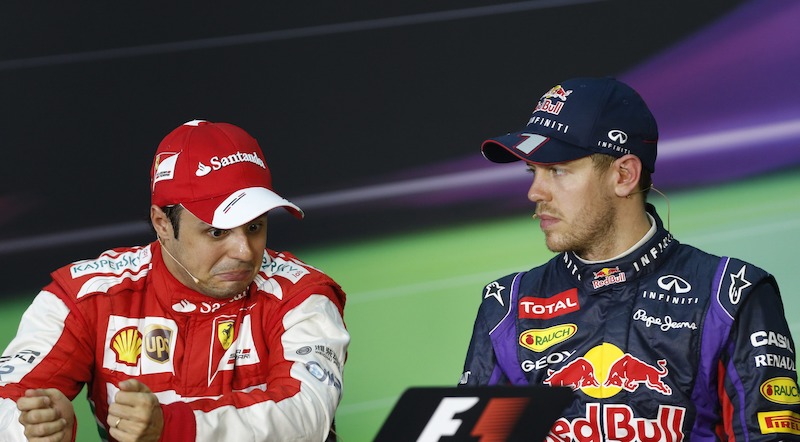 Sebastian Vettel, el más rápido en la sesión de clasificación, y Felipe Massa (d), segundo, comparecen ante los medios en la rueda de prensa oficial de la FIA.