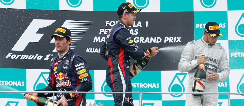 Sebastian Vettel celebra su primera victoria del año, en el Gran Premio de Malasia.