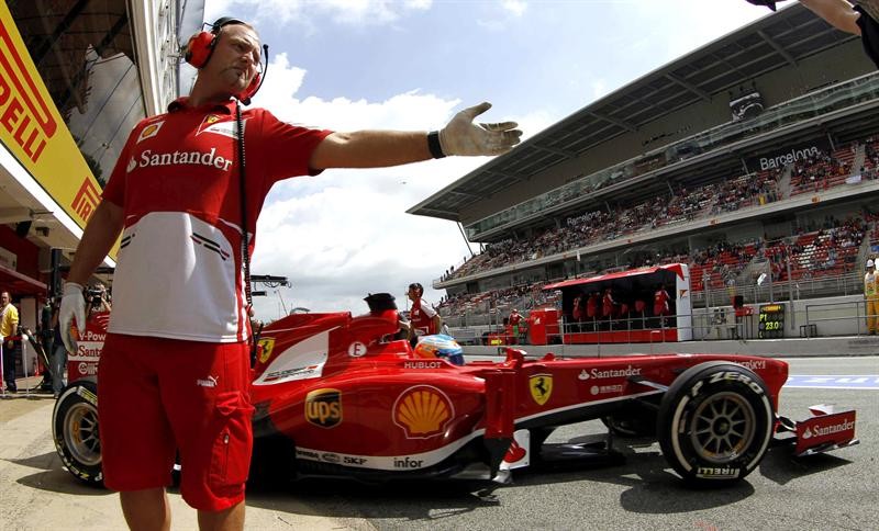 Fernando Alonso sale del box de su equipo durante la tercera tanda de entrenamietos libres en el Circuito de Cataluña.