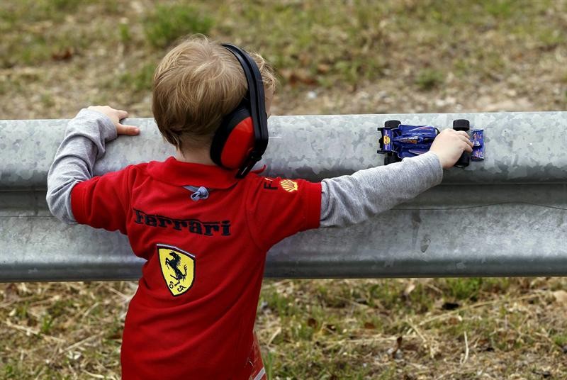 Un niño ataviado con una camiseta del equipo Ferrari juega con una replica de un monoplaza del equipo Red Bul.