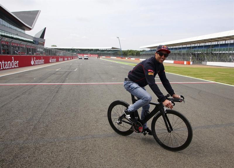 El piloto de Toro Rosso Ricciardo monta en bicicleta en la pista de Silverstone.