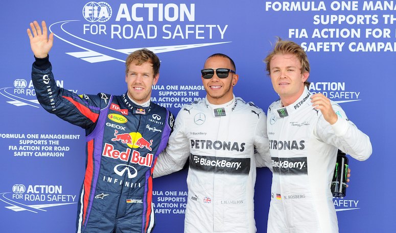 El inglés Lewis Hamilton (c) posa para los medios junto su compañero en Mercedes, el alemán Nico Rosberg (d), y el también germano Sebastian Vettel tras la sesión de clasificación en Silverstone.
