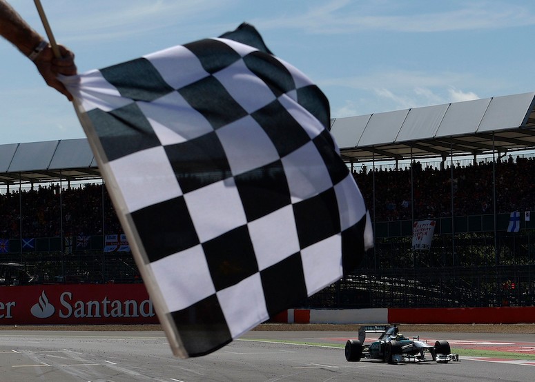 Momento en el que Nico Rosberg cruza la línea de meta como ganador de la carrera en Silverstone.