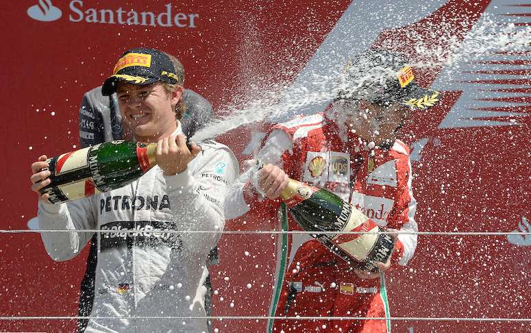 El español Fernando Alonso (d) celebra su tercer puesto en el podio de Silverstone, escenario del Gran Premio de Gran Bretaña de Fórmula Uno, junto al ganador de la carrera, el alemán Nico Rosberg.