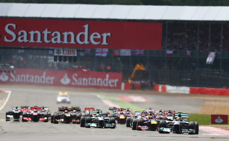 Momento de la salida de la carrera en Silverstone, donde Lewis Hamilton partió desde la primera posición por delante de Nico Rosberg, Sebastian Vettel y Mark Webber.