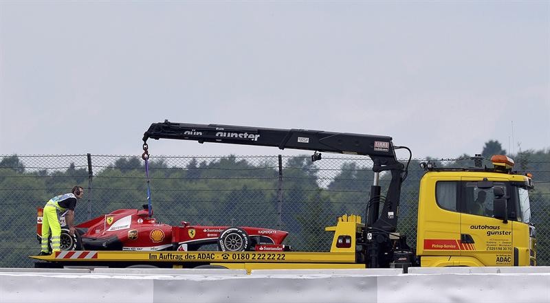 El coche de Fernando Alonso, de Ferrari, es trasladado a la calle de garajes durante la primera sesión de entrenamientos libres en el circuito de Nürburgring tras un fallo eléctrico.