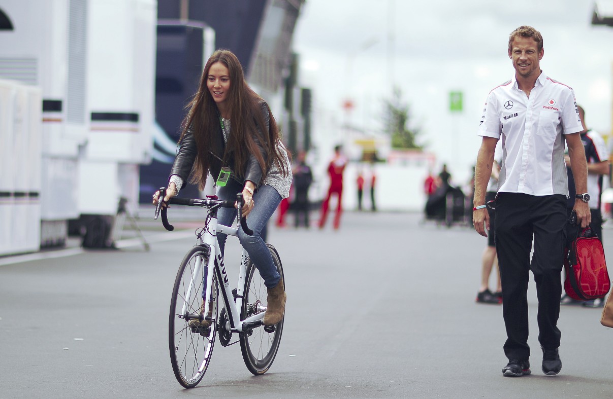 El piloto de McLaren Jenson Button pasea mientras su novia Jessica Michibata monta en bici por el circuito.