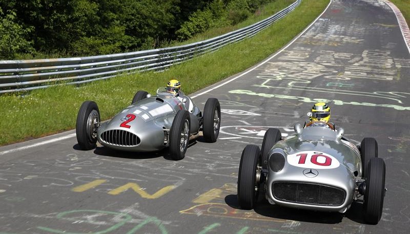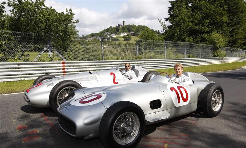Lewis Hamilton y Nico Rosberg, de la escudería Mercedes AMG, montan sobre dos clásicos flechas plateadas, modelos W 196 y W 154, en el circuito de Nürburgring.