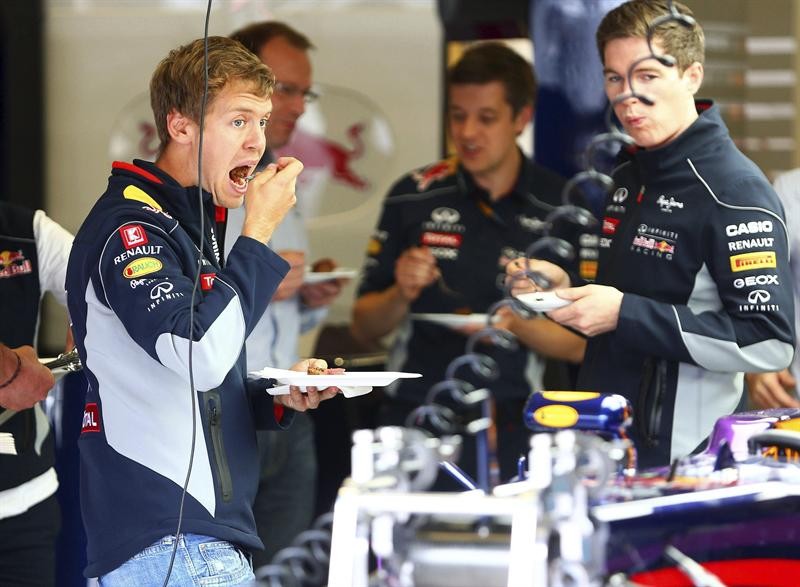 El piloto alemán de Fórmula Uno Sebastian Vettel, de la escudería Red Bull, come un pedazo de su tarta de cumpleaños.