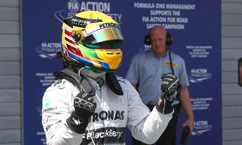 El británico de Mercedes Lewis Hamilton celebra la 'pole' conseguida en el Gran Premio de Alemania.