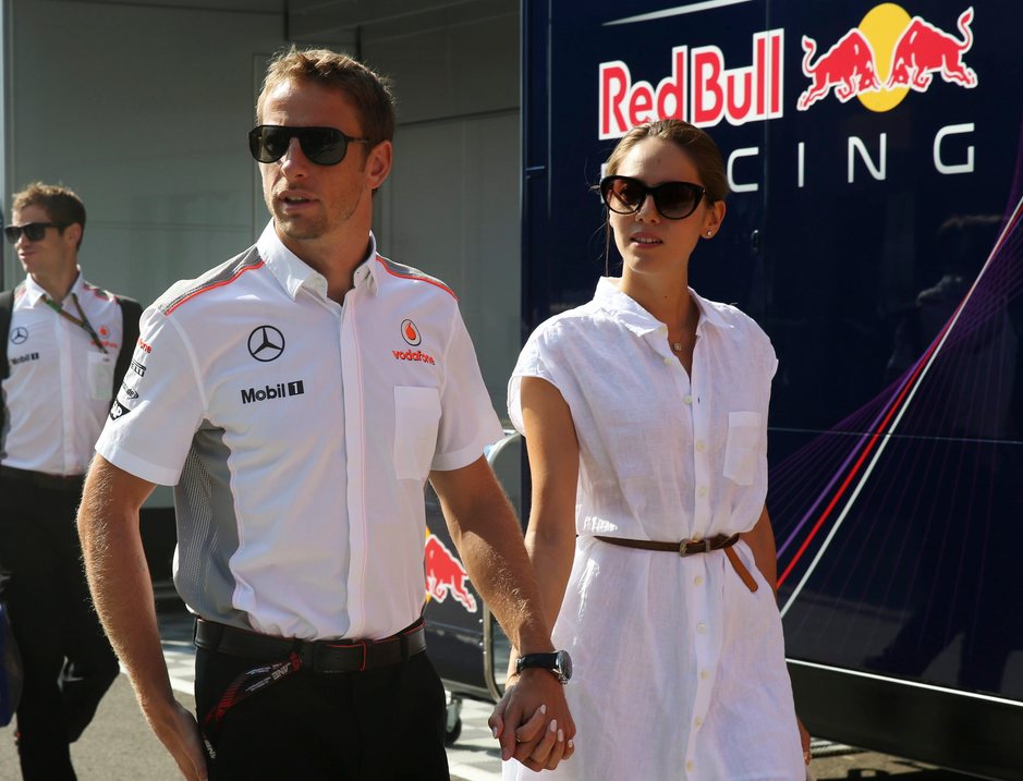 El piloto inglés Jenson Button (McLaren) llega al paddock junto a su novia, la bella modelo Jessica Michibata, ntes de participar en la tercera sesión de entrenamientos libres del GP de Hungría.