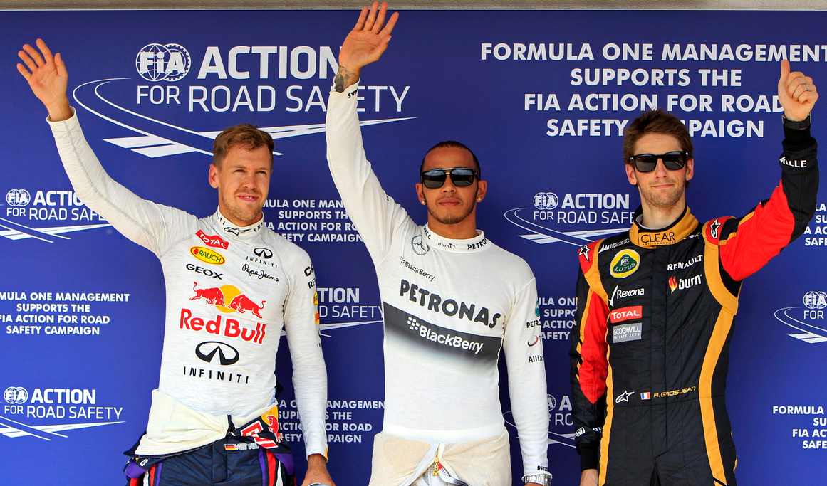El inglés Lewis Hamilton (c) ha logrado en el circuito de Hungaroring la cuarta pole del curso -trigésima de su carrera en la Fórmula Uno-, al ser el más rápido por delante del alemán Sebastian Vettel (i) y el francés Romain Grosjean (Lotus).