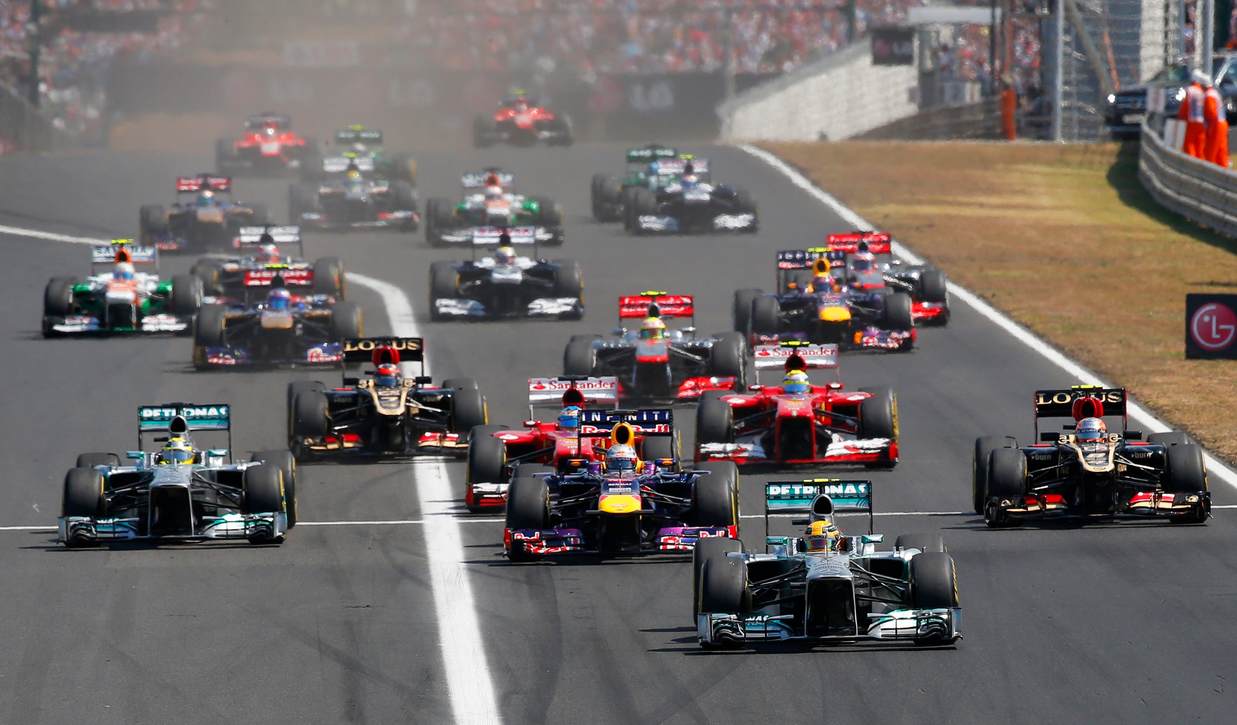 Momento de la salida de la carrera en Hungría, con Lewis Hamilton en primera posición por delante de Sebastian Vettel, Romain Grosjean y Nico Rosberg.