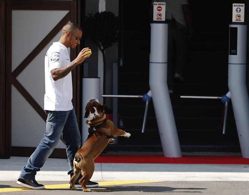 Lewis Hamilton, de la escudería Mercedes AMG, juega con su perro en el circuito de Monza en Italia.
