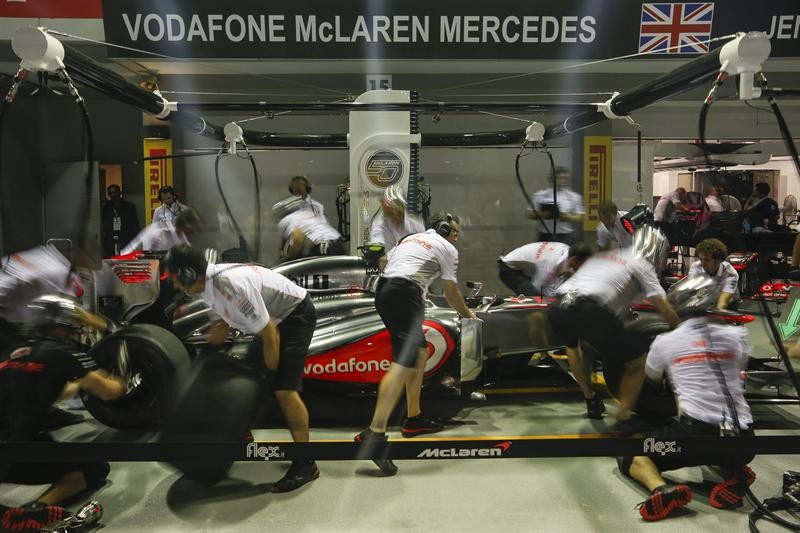 Varios mecánicos de la escudería McLaren Mercedes trabajan en el monoplaza del piloto mexicano Sergio Perez, en la zona de garajes del circuito del Gran Premio de Singapur.
