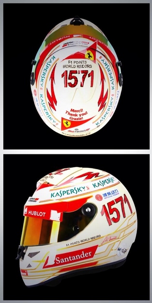 En el casco, que el asturiano ha mostrado este martes en Twitter, predomina el blanco sobre el rojo y en la parte alta, aparte de la inscripción, en inglés, "1.571 Récord mundial de puntos F1" ("F1 Points World Record"), Fernando da las "gracias" en sus idiomas respectivos, a las tres escuderías con las que ha puntuado.