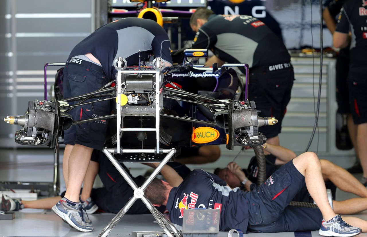 Los mecánicos del equipo Red Bull ultiman la puesta a punto de los monoplazas.