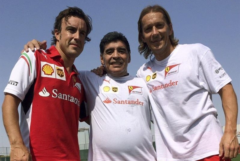 El piloto español Fernando Alonso, dos veces campeón del mundo de Fórmula 1, jugó en Dubai un partido de fútbol de unos cuarenta minutos en el que participaron los exfutbolistas Diego Armando Maradona, Míchel Salgado, Alfonso Pérez y Patxi Salinas.