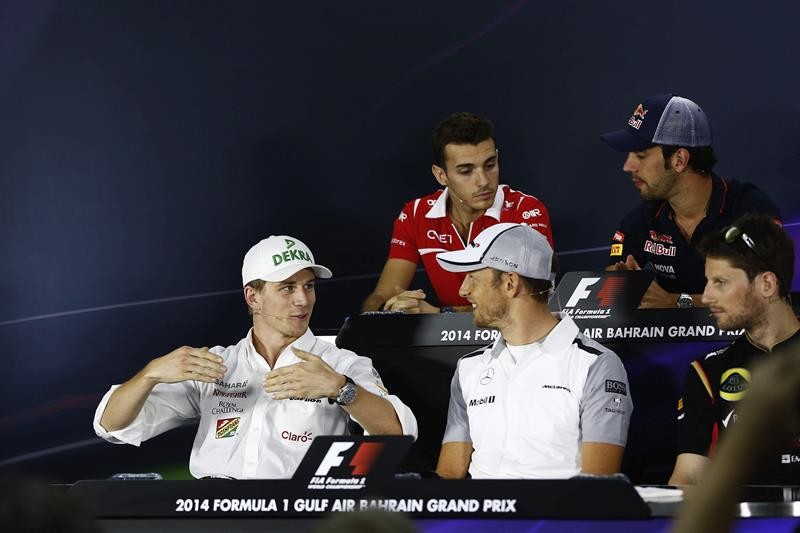 Nico Hulkenberg (izda) conversa con el británico Jenson Button (c) durante la rueda de prensa ofrecida en el circuito Sakhir de Manama.