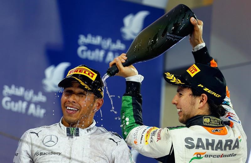 El piloto de Force India Sergio Pérez riega a Lewis Hamilton durante el podio del GP de Bahrein.