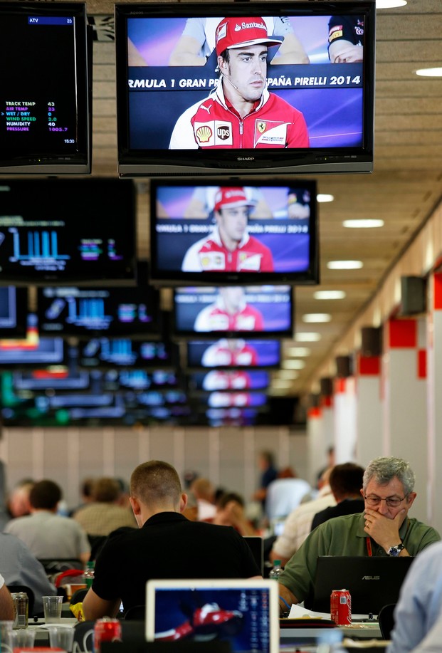 Los periodistas siguen la rueda de prensa de Fernando Alonso en el Circuito de Barcelona.