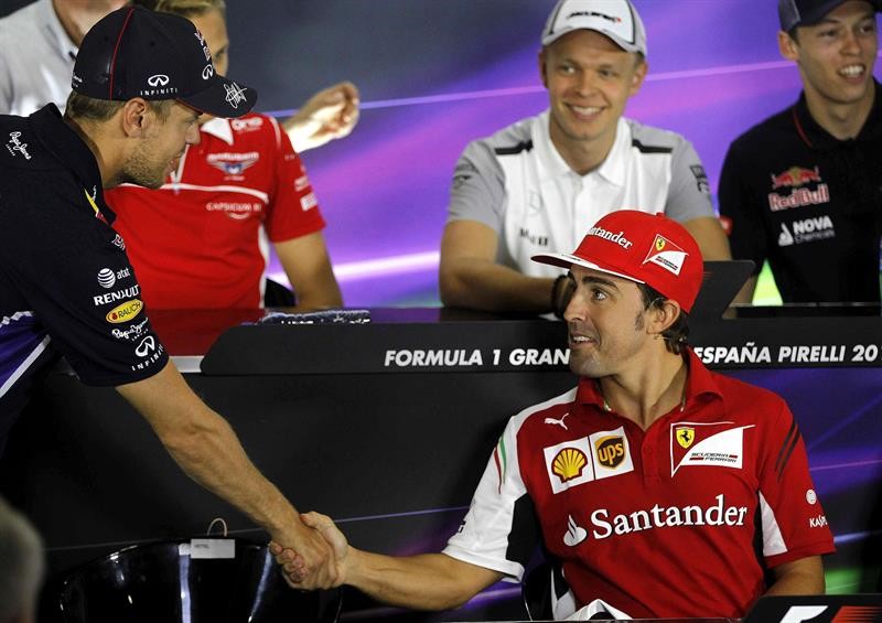 Sebastian Vettel, piloto de Red Bull, saluda amigablemente a Fernando Alonso antes de comenzar la rueda de prensa previa al Gran Premio de España.