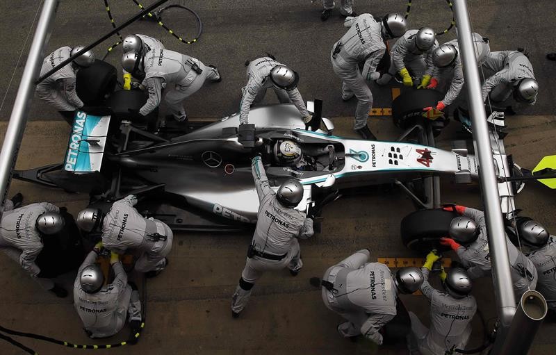 El equipo Mercedes cambia los neumático a Lewis Hamilton, líder del Mundial, durante la carrera.