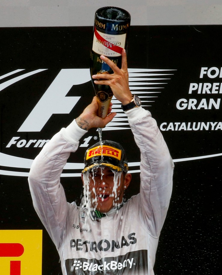Lewis Hamilton se divierte en el podio para celebrar su primera victoria en el trazado español.