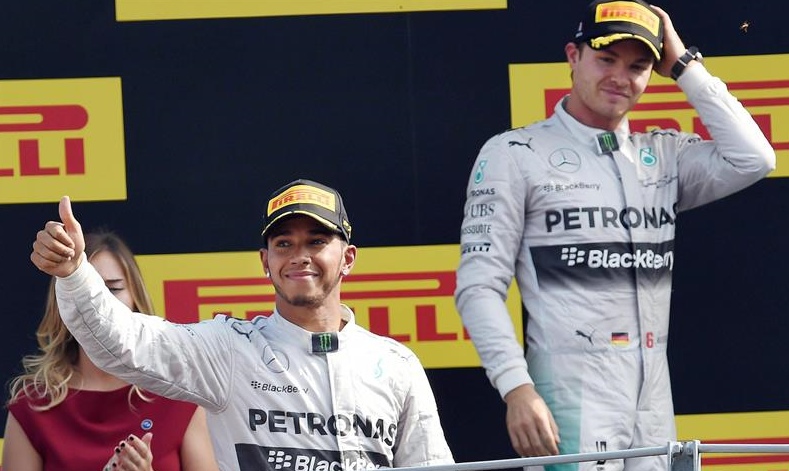 Lewis Hamilton celebra su victoria en el podio de Monza, escenario del Gran Premio de Italia, por delante de Nico Rosberg. El alemán se mantiene al frente del Mundial con 238 puntos, aunque ve cómo Hamilton le recorta ahora siete (216).