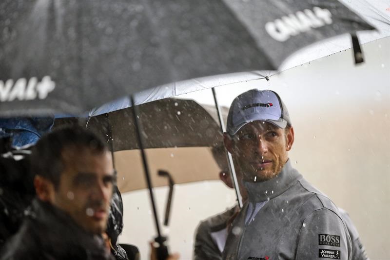 El tifón Phanfome amenaza la disputa d ela carrera. En la imagen, Jenson Button con paraguas.