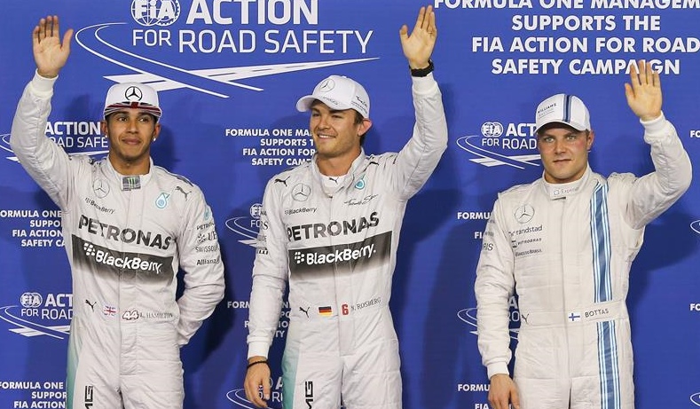 Nico Rosberg (c) saldrá este domingo desde la pole position en el Gran Premio de Abu Dhabi, la última carrera de Fórmula Uno de la temporada, por delante de su compañero Lewis Hamilton (i) y del finlandés Valteri Bottas (Williams).