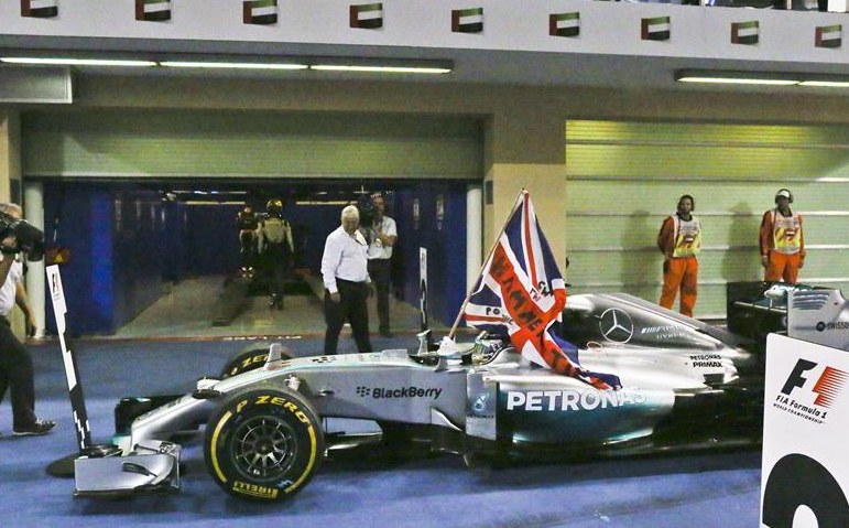 Lewis Hamilton posa orgulloso con la bandera británica tras su victoria en el circuito de Yas Marina.