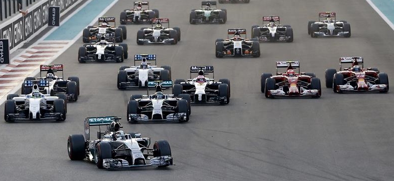 Inicio de la carrera en Abu Dhabi, justo en el momento en el que Lewis Hamilton (en primer plano), que salía segundo, consigue adelantar a su compañero Nico Rosberg.