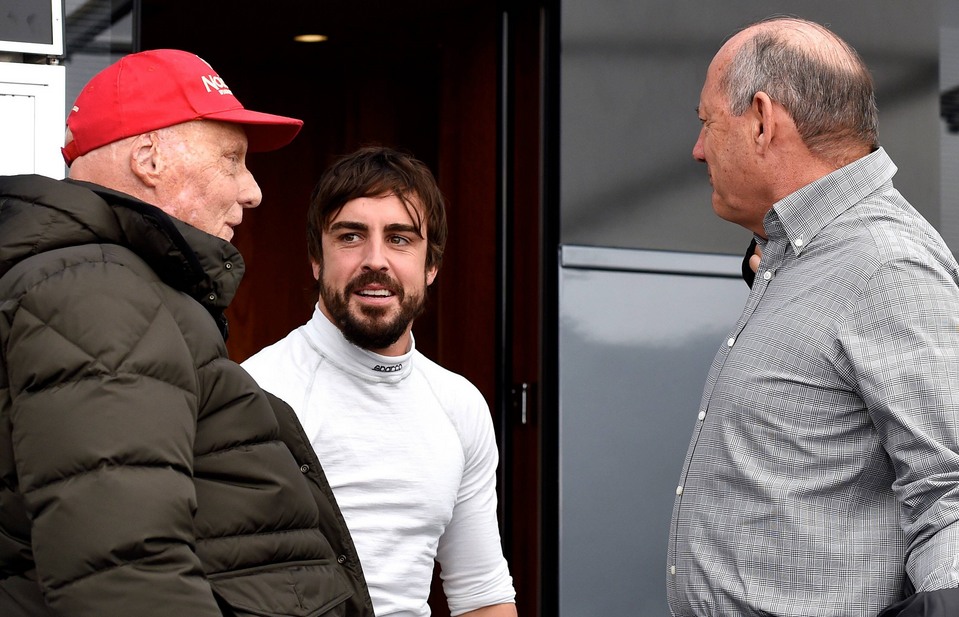 Fernando Alonso conversa con el expiloto austriaco Niki Lauda y Ron Dennis (d), presidente ejecutivo de McLaren.