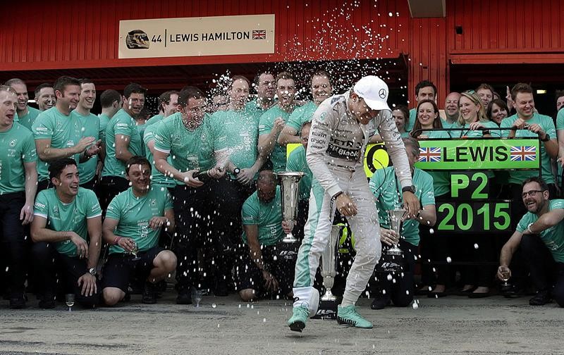 Nico Rosberg celebra con los miembros del equipo Mercedes la victoria en Cataluña.