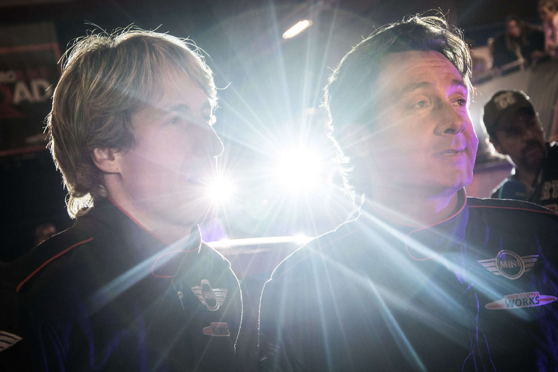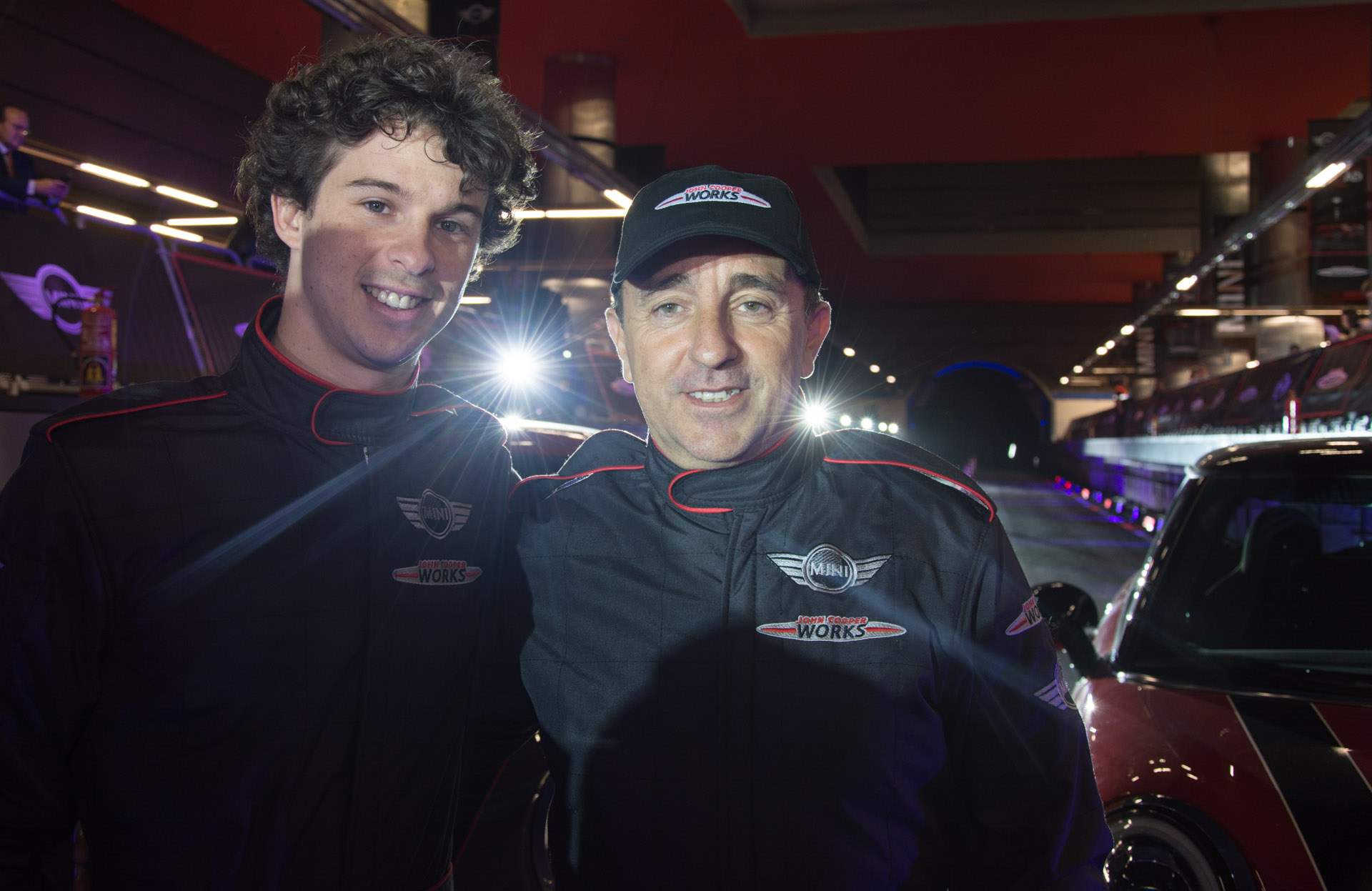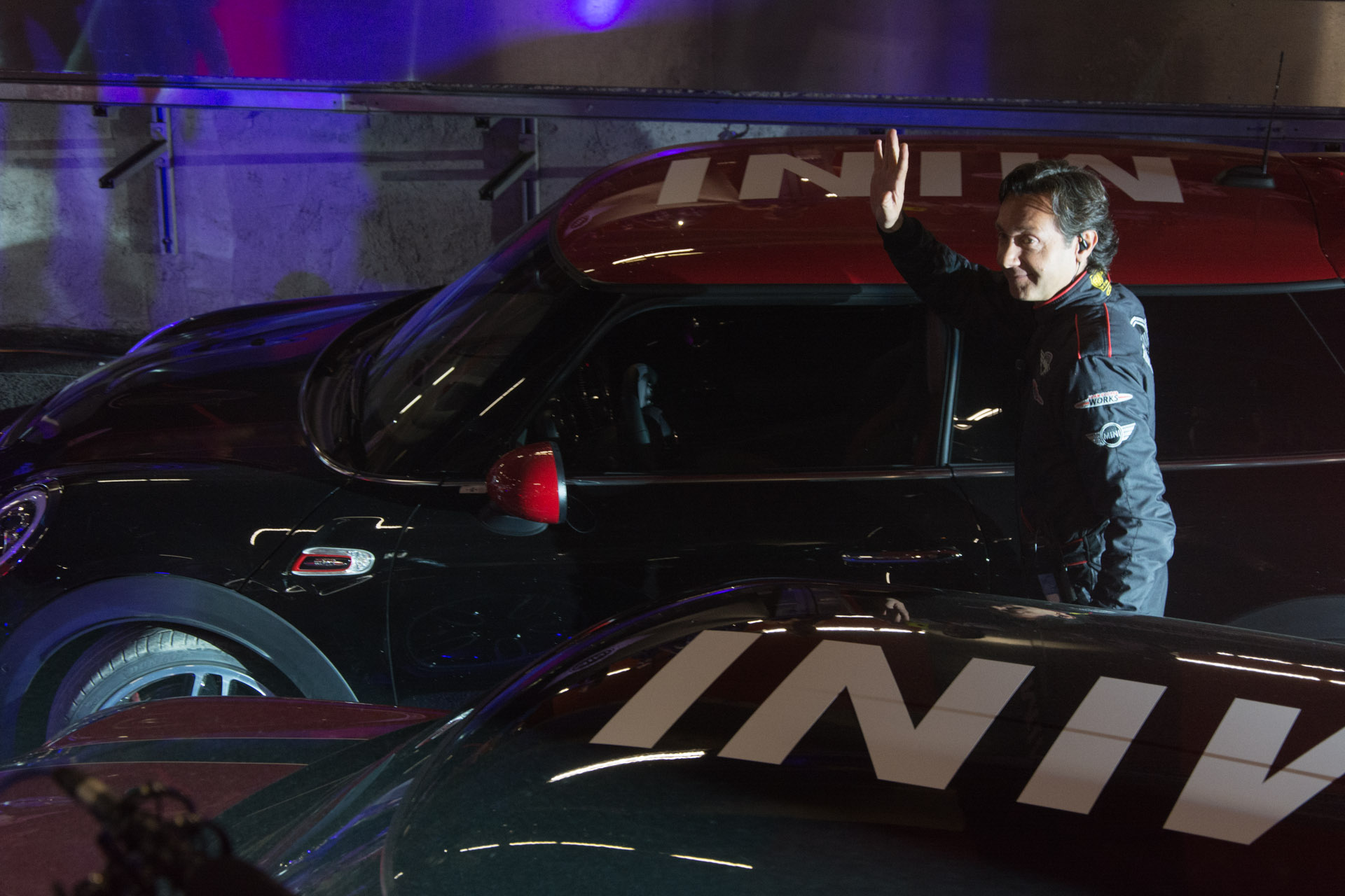 Los pilotos Nani Roma, David Izaguirre, Víctor Sáez, Javi Villa y Luis Miguel Reyes se preparan para la exhibición. Cuatro nuevos Mini John Cooper Works y un Mini clásico esperan en la pista de carreras improvisada.