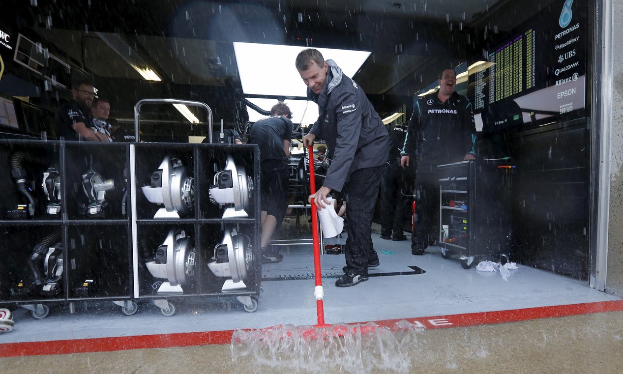 Un miembro de Mercedes achica agua del box del equipo en el circuito Gilles Villeneuve de Montreal.